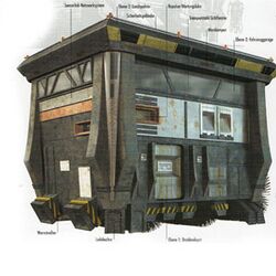 Diese Einheiten verlassen und betreten das HQ von zwei einziehbaren Rampen auf beiden Seiten des Rumpfes. Die zweite Ebene des HQs dient als Parkgarage für Gefährte wie etwa Landgleiter, die von den menschlichen Besatzungsmitgliedern und den Aufsehern verwendet werden, die häufig an Bord des 850.AA stationiert sind. Die Garage kann 2 Gefährte aufnehmen, die bis 10 Meter lang sind.