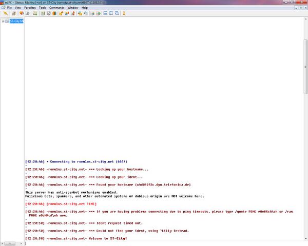 Hier nun wählt man den Server "St-City" aus, indem man unter "IRC Network:" das Popup aufmacht und unter "S" danach sucht. Hat man ihn gefunden betätigt man die Schaltfläche "Connect to Server". Das Programm wird nun versuchen sich mit dem Netzwer zu verbinden. Das Statusfenster gibt genauere Auskunft darüber (das normalerweise am Anfang einzig geöffnete Fenster im