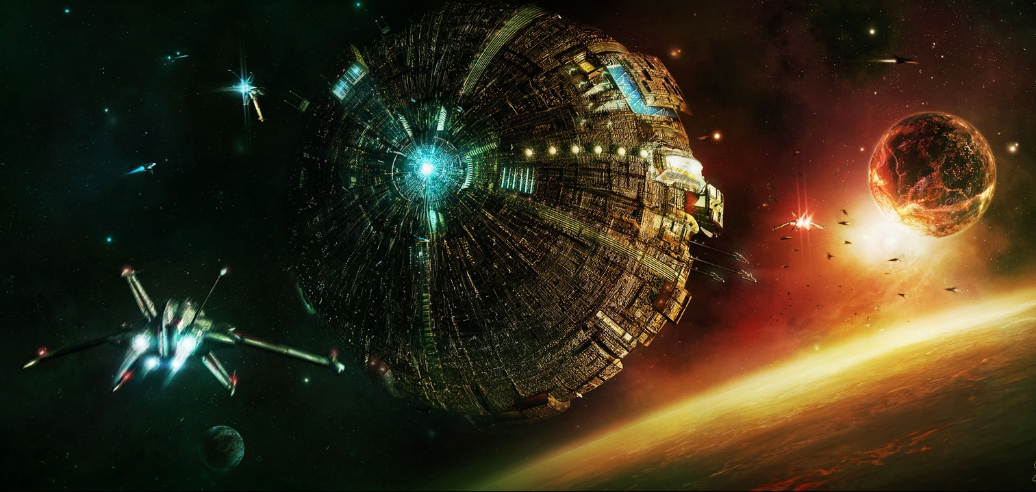 Der dritte Todesstern im Orbit von Geonosis. Im Hintergrund ist einer der rohstoffreichen Monde des Planeten zu sehen, die für den Bau des Todessterns abgetragen wurden.